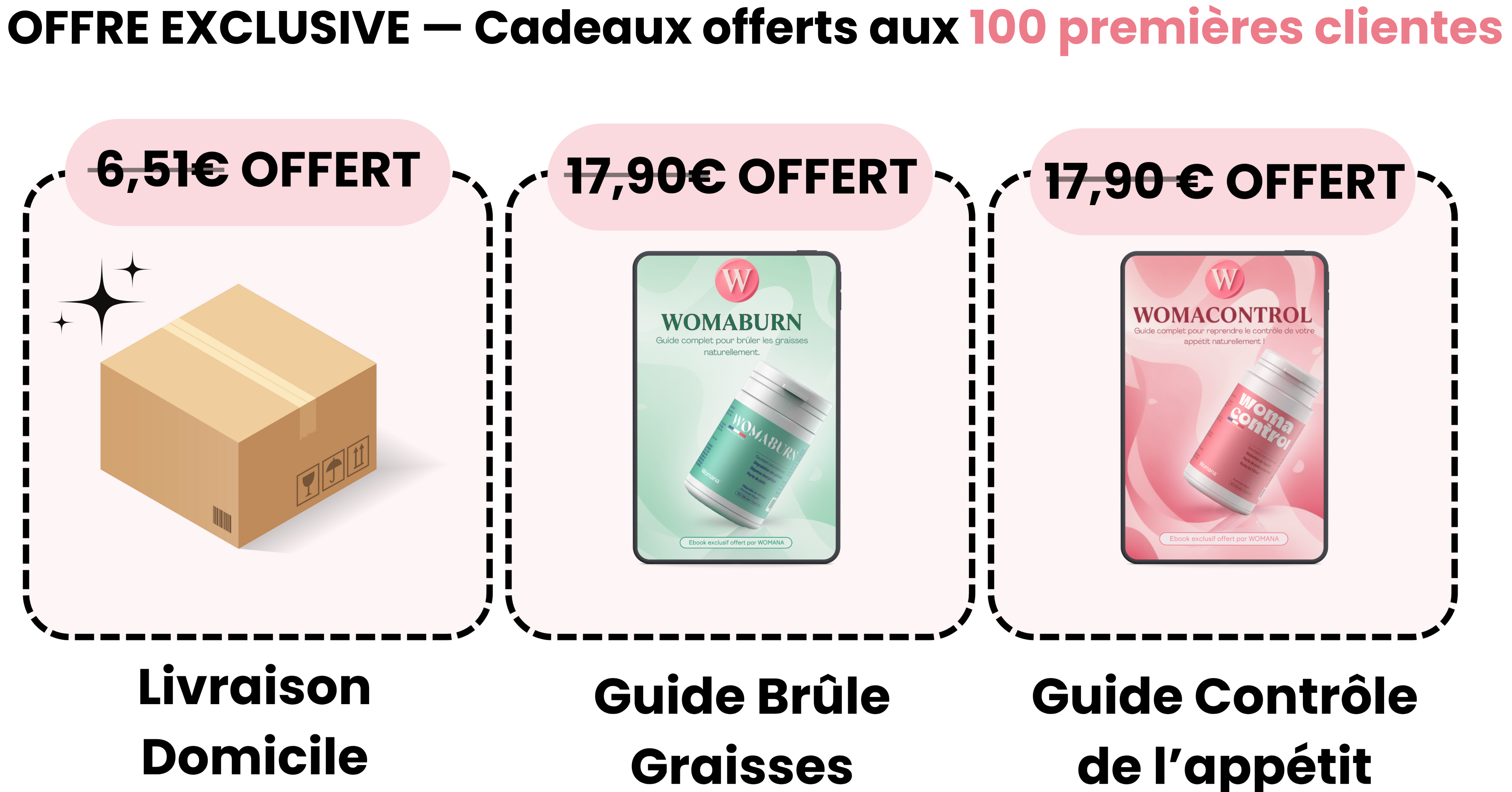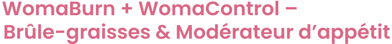 🌿 Ce duo agit en synergie : WomaControl régule l’appétit au quotidien, tandis que WomaBurn stimule naturellement la combustion des graisses.